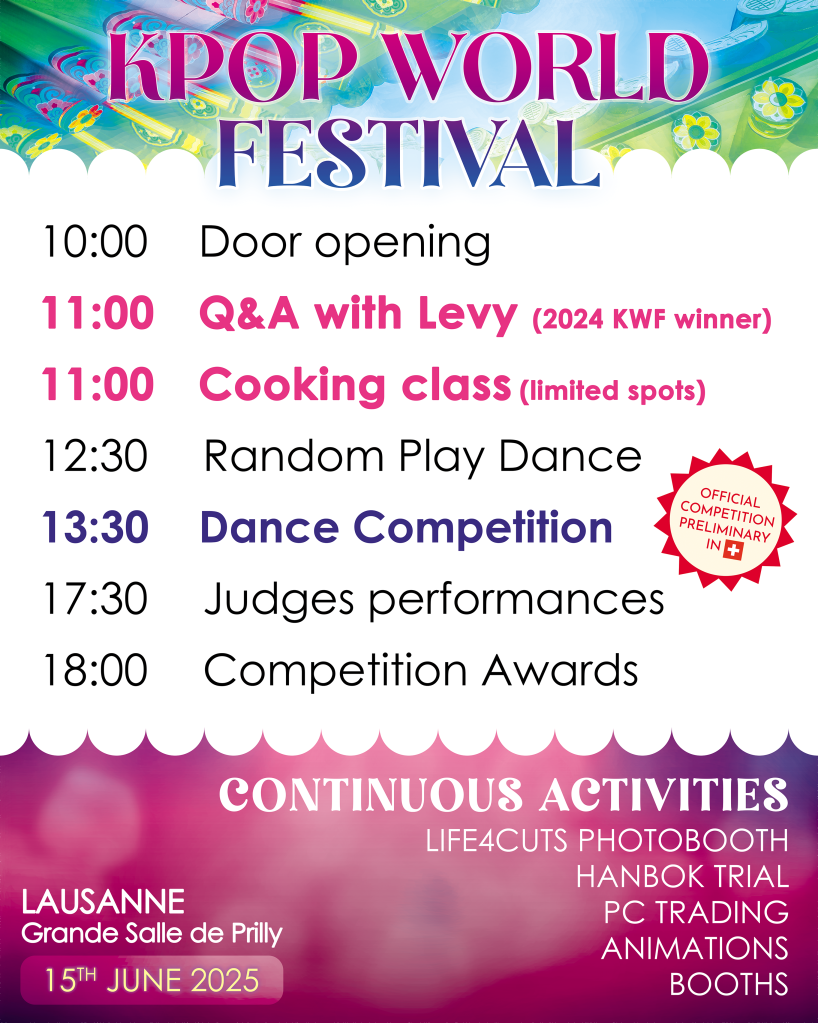 In addition to physical prizes, the first-place winners will earn the prestigious title of official representatives of Switzerland in the KPOP World Festival, held in Changwon, South Korea. This makes the opportunity even more significant for the winners, as they’ll not only represent Switzerland but also have the chance to perform on a global stage alongside top K-Pop talent from around the world.*